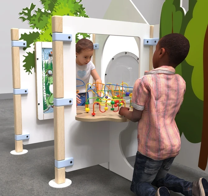 フェンス、インタラクティブプレイシステム、壁面ゲーム、ルーピングテーブルがセットになったプレイコーナーです。