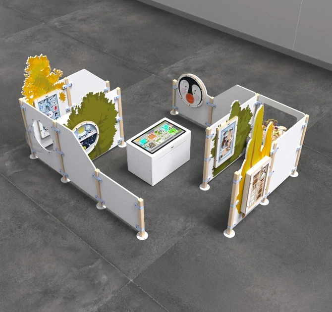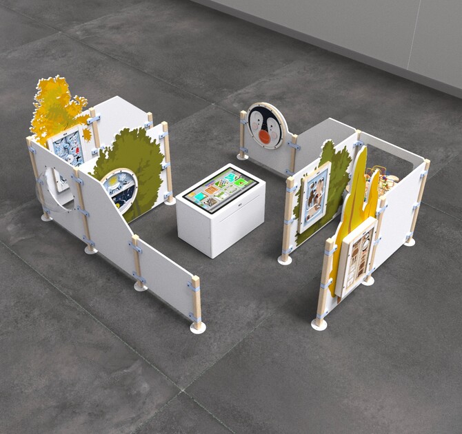 9つのプレイモジュールとひとつのビーズツリーテーブルがついた11のプレイゲート、8つのゲームを楽しめる32インチ画面のタッチテーブルが含まれます。