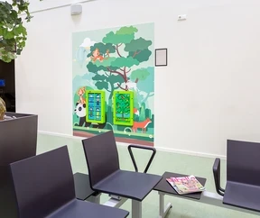 Een vrolijke wachtruimte met veel kleuren, dieren en speelplezier voor kinderen. De wachtruimtes van Zuyderland ziekenhuis zijn volledig kindvriendelijk. Spelen helpt kinderen om een rustig en ontspannen gevoel te behouden, een bezoek aan het ziekenhuis is voor kinderen tenslotte al spannend genoeg. Naast een gastvrije indruk, zorgt het ook voor een rustige sfeer tijdens het wachten.