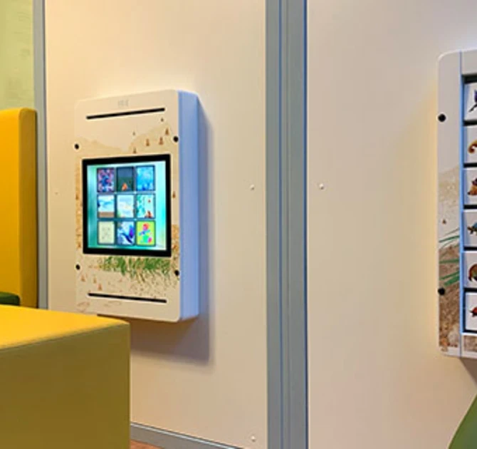 IKC ontwikkelde voor dit ziekenhuis speciale custom software voor het 17 inch touchscreen, hierop kunnen kinderen interactief spelen en komen zij de herkenbare elementen uit het ziekenhuis tegen. De behuizing van de wandmodules zijn ook custom made, hierop zijn verschillende graphics aanbracht om de modules nog passender bij de ruimte te maken.