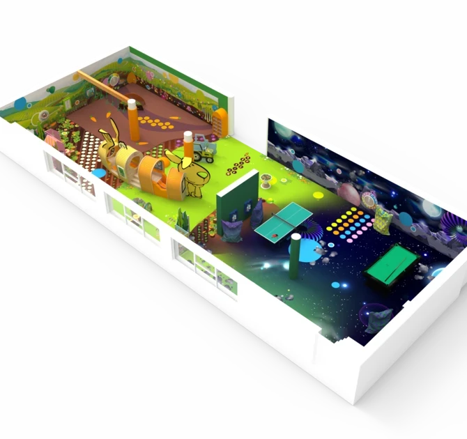 Het resultaat is een op maat ontworpen speelconcept van circa [X m²], volledig geïntegreerd in de visuele identiteit van het park. Verspreid over meerdere speelzones met elk een eigen thema komen Sunny Bunny en Pinky Bunny tot leven in een omgeving die uitnodigt tot spel en verbeelding.