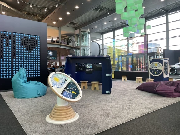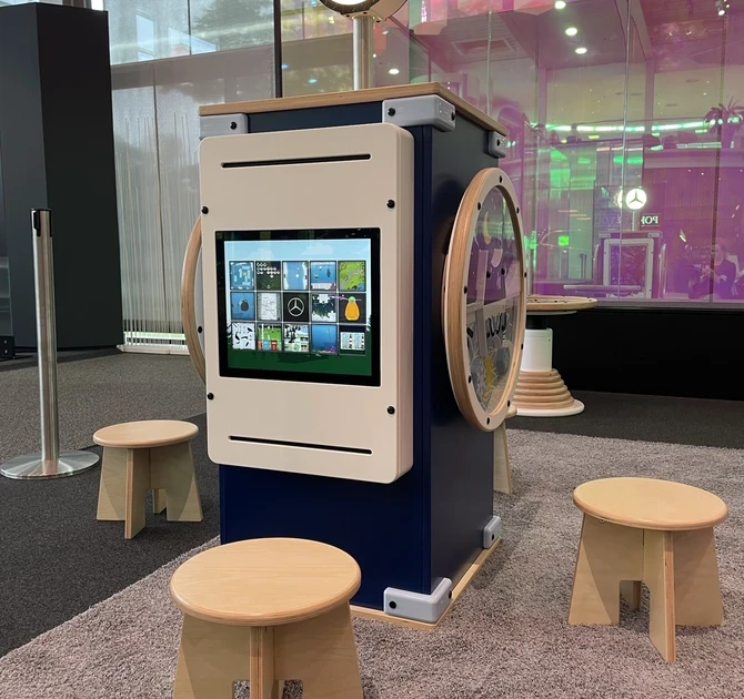 Naast de EQS zijn er ook andere interactieve speelelementen geplaatst die perfect aansluiten bij het design van het Kundencenter. Denk aan digitale touchscreens, educatieve wandspellen en comfortabele speelhoeken die uitnodigen tot ontdekken en ontspannen. Alles werd ontworpen met oog voor detail en in harmonie met de premium uitstraling van het merk.
