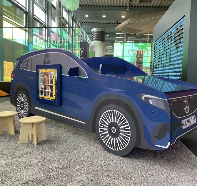 Centraal in de nieuwe kinderhoek staat een schaalmodel van de Mercedes EQS, een luxe elektrische limousine die speciaal is aangepast voor jonge autoliefhebbers. Het realistische dashboard, het stuur en de interactieve elementen geven kinderen het gevoel zelf achter het stuur van de toekomst te zitten. Zo ervaren ze spelenderwijs de wereld van elektrische mobiliteit, helemaal in lijn met het vooruitstrevende EQ-concept van Mercedes-Benz.
