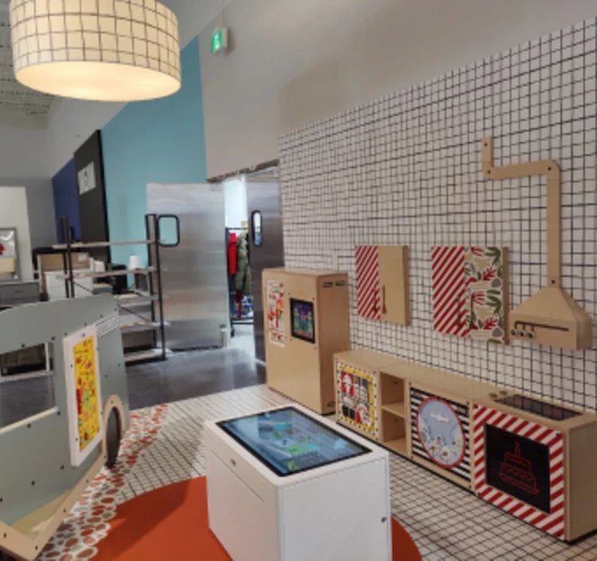Kinderen kunnen hun fantasieën tot leven brengen in deze gevarieerde speelhoek. De speelkeuken, de Delta 32-inch touchtable en de iconische Tepperman's truck bieden verschillende mogelijkheden voor plezier en leren. Verschillende wandspellen zoals de Square Logic, en een gecustomized Abacus Wheel en Sliding Puzzle verrijken de speelervaring nog meer, zodat kinderen zich nooit hoeven te vervelen wanneer zij samen met hun ouders een bezoek brengen aan Tepperman's. In de keuken voegt een Delta 17-inch scherm een interactieve factor toe, kinderen worden uitgenodigd om deel te nemen aan fantasierijke rollenspellen en om samen te werken.