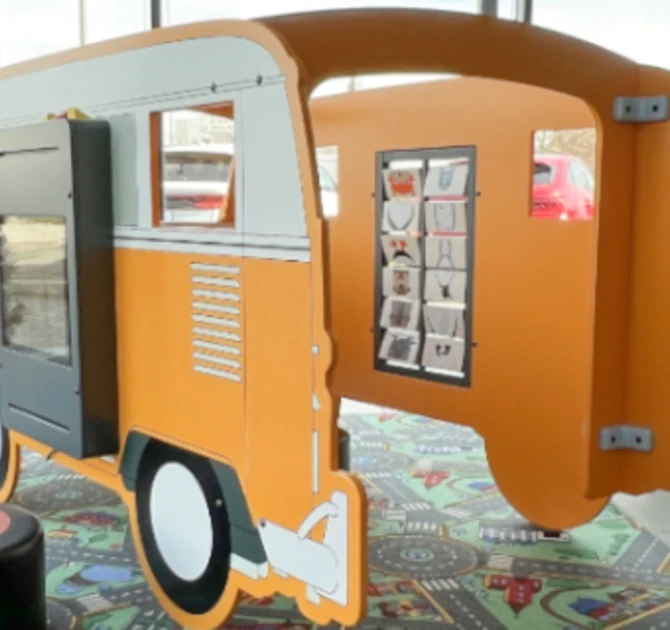 De speelelementen in de kinderhoek zijn volledig custom. Alle houten elementen worden met de silkprint-techniek in de bedrijfskleuren geverfd. Het frame van de spelmodule die op de IKC Van is geplaatst, is ook aangepast naar de grijze kleur in het logo van AVP autoland. Als unieke zitoplossing is er een softplay zitkussen gemaakt in de vorm van een autoband. In de velg komt de oranje kleur van het AVP logo weer naar voren. Onze Softplay zitkussens worden per stuk met de hand gemaakt. Dit maakt iedere Softplay uniek!
