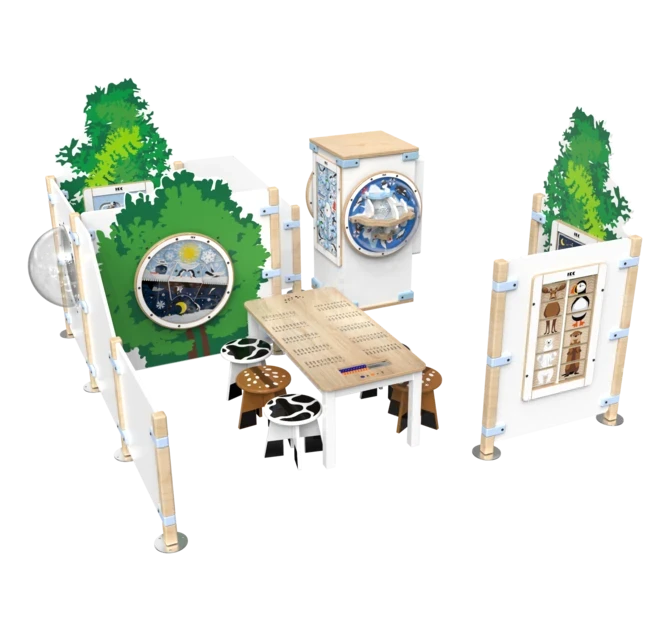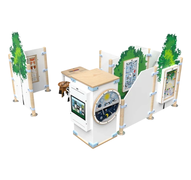 Onze designers hebben dit complete speelhuis voor u samengesteld uit hekwerken, interactieve speelsystemen en spelmodules.