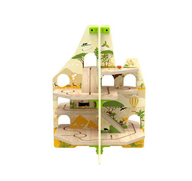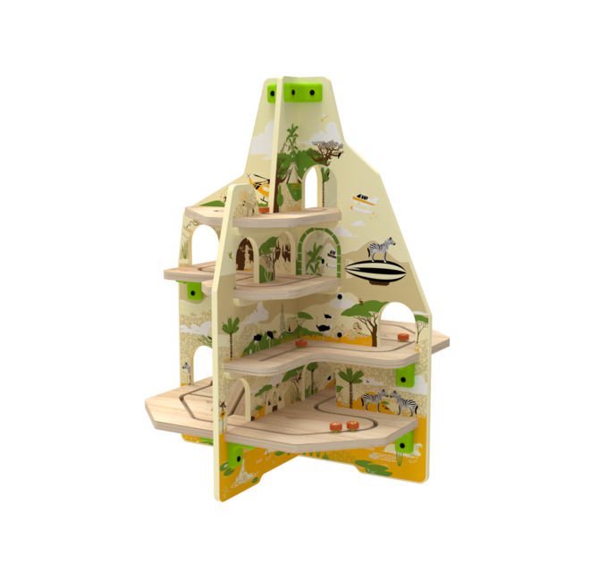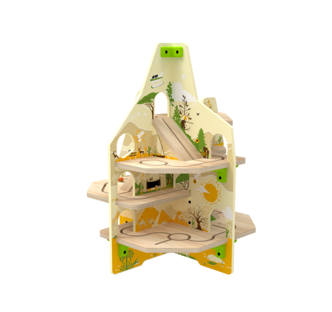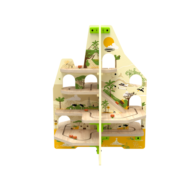 Dune Trail is een zelfstandig speelelement met diverse woestijnthema’s die de verbeelding van kinderen prikkelen. Met beweegbare knoppen in het paneel kunnen kinderen hun safarivoertuig langs kronkelende paden leiden, zandheuvels beklimmen en door tunnels reizen – allemaal binnen een kleurrijk woestijnlandschap.