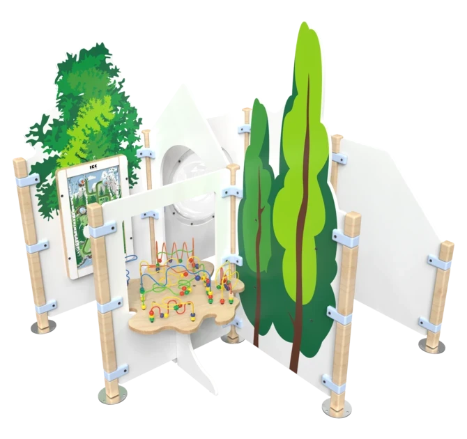 Onze designers hebben dit complete speelhuis voor u samengesteld uit hekwerken, interactieve speelsystemen en spelmodules.
