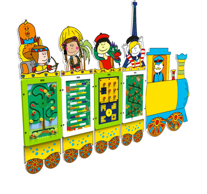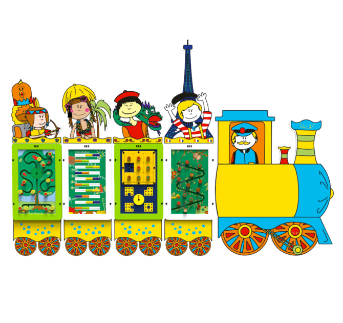 Speelsysteem Culture express is een wandpaneel speciaal voor het monteren van één ronde en vier rechthoekige wandspellen aan de muur. Het speelsysteem heeft een circus thema, het wandpaneel heeft de vorm van een trein met vier treinwagons erachter.