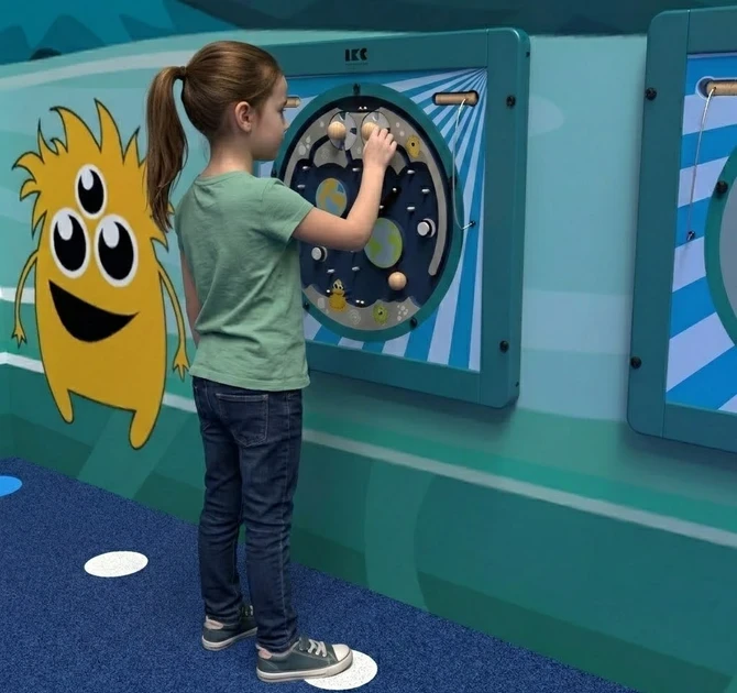 Het vierkante speelpaneel kan aan de muur of aan een IKC speelsysteem bevestigd worden, hierdoor neemt het wandspel weinig ruimte in beslag. Het frame is gemaakt van sterk beukenhout dat gemakkelijk schoon te maken is. De Shooting Stars kan goed gecombineerd worden met de IKC softplays en meubilair.