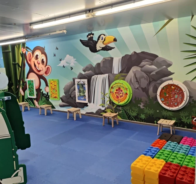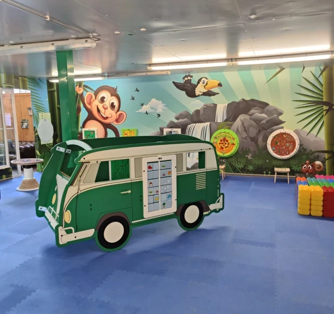 Naast de kinderhoek bevindt zich een slim ontworpen cateringruimte met zelfbedieningsopties. Deze ruimte stelt ouders in staat om te ontspannen en een moment van rust te pakken, terwijl hun kinderen de speelhoek kunnen verkennen en rustig spelen. De zelfbedieningsopstelling zorgt voor gemak en maakt het geheel zo tot een fijne ervaring voor gezinnen.
