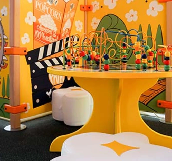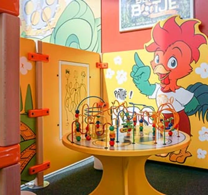 Zo hangen er speciaal ontworpen Memory en Sliding Puzzle wandspellen in Pathé stijl, en heel veel andere leerzame, analoge spelmodules voor alle leeftijden. Er hangt ook een modern, interactief Delta 17 speelsysteem met spelletjes geheel in het thema van de bioscoop, met mascotte Charlie erin verwerkt!