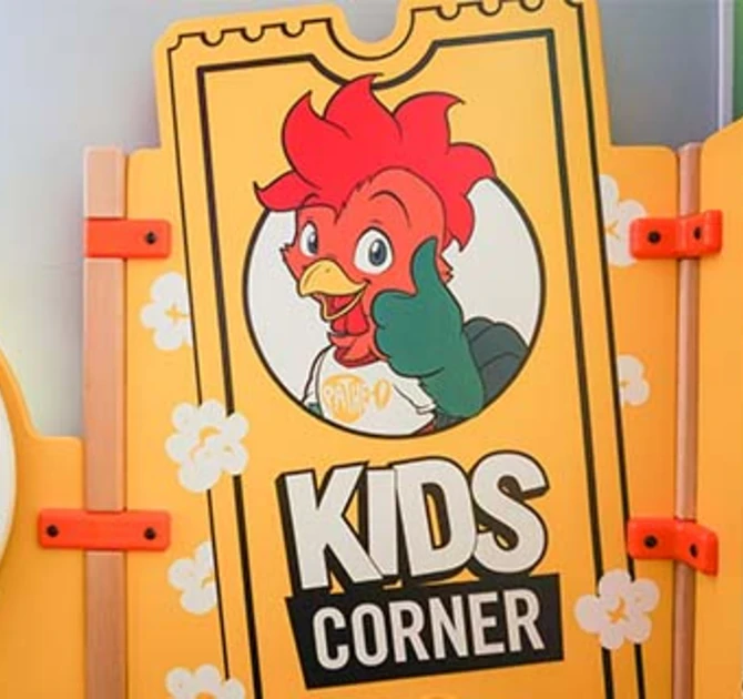 Overal in deze kleurrijke fantasiewereld is de Pathé mascotte Charlie te vinden, alsook een heleboel popcorn op de speelhekken, de Watch Tower met glijbaan en zelfs levensgrote popcorn Softplays om op te zitten en mee te spelen. De ruimte is verder versierd met een bijpassend wanddesign, een gezellige kindertafel om aan te zitten kleuren, en allerlei verschillende wandspellen om uit te proberen.