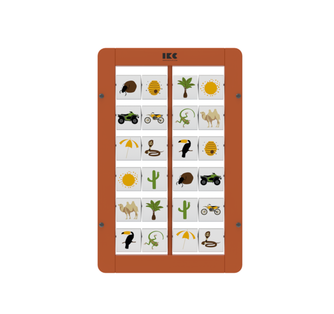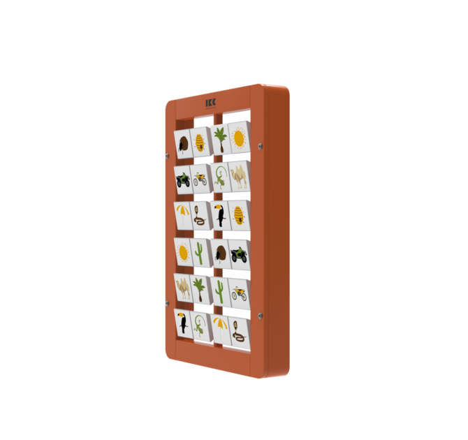 Dit speelpaneel kan eenvoudig aan de muur of in een IKC speelsysteem worden bevestigd, waardoor het nauwelijks ruimte inneemt. Het frame is gemaakt van duurzaam beukenhout en is leverbaar in verschillende kleurcombinaties. Zo past het Desert Memory wandspel perfect in iedere speelomgeving en laat het zich goed combineren met IKC softplays en meubilair.