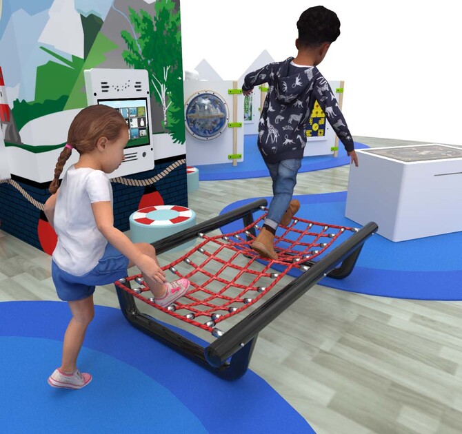 Wij kunnen extra klim en klauter plezier toevoegen aan de speelvloer door klimelementen zoals deze Rope bridge te plaatsen. Hier kunnen kinderen, dankzij de EPDM vloer, veilig overheen bewegen.