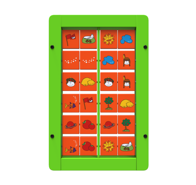 Het speelpaneel kan aan de muur of aan een IKC speelsysteem bevestigd worden, hierdoor neemt het wandspel weinig ruimte in beslag. Het frame is gemaakt van sterk beukenhout en is beschikbaar in groen met wit, wit met blauw en groen met oranje, het wandspel past daardoor in elke speelhoek. Memory kan goed gecombineerd worden met de IKC softplays en meubilair.