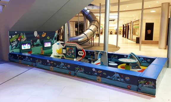Dzięki niestandardowemu projektowi składającemu się zarówno z interaktywnych jak i wolnostojących systemów zabaw, przekształciliśmy ten specyficzny obszar w potworkowy wszechświat. Często przestrzeń pod schodami i ruchomymi schodami jest postrzegana jako przestrzeń zmarnowana, dlatego ten kącik zabaw był idealnym rozwiązaniem dla centrum handlowego.