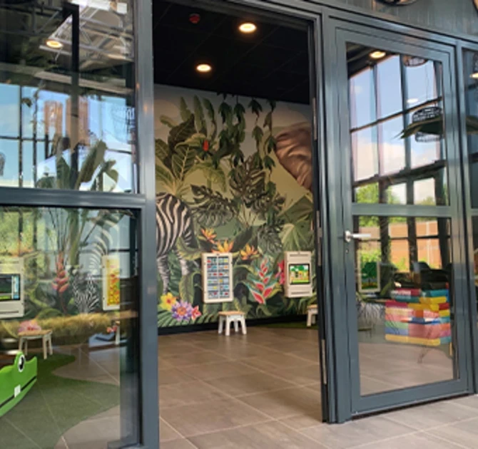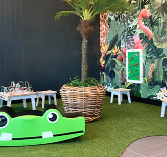 Kącik zabaw robi wrażenie nie tylko na dzieciach, ale i na rodzicach. Konstrukcja ściany Dżungli o wysokości 3,50 m i szerokości 9,60 m zapewnia optymalne wrażenia. Naturalnej wielkości zwierzęta na ścianie sprawiają, że kącik do zabawy przyciąga wzrok! Poprzez dodanie dekoracji ściennej w stylu dżungli, dobrze wpisuje się w wygląd centrum ogrodniczego.