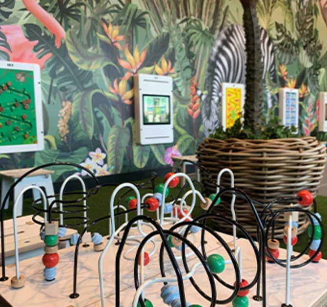 Dzieci mogą usiąść na wysokich krzesełkach z kolekcji Buxus, bawiąc się przy tym jednym z ściennych modułów do zabawy lub interaktywnym systemie. Dzieci mogą pobawić się także z stołem z koralikami Buxus i miękkim elementem do zabawy Balance racer.