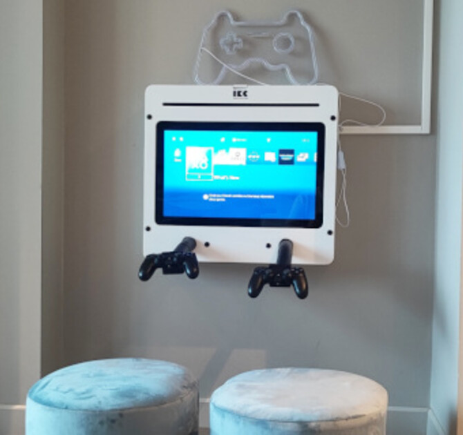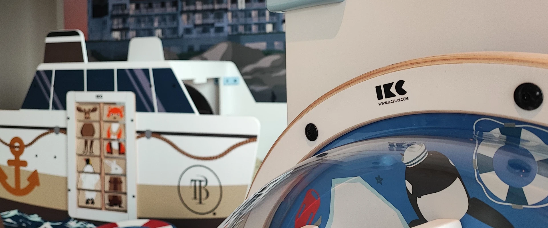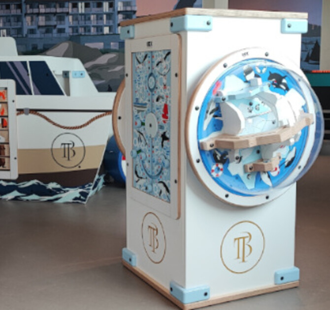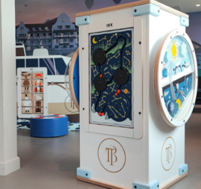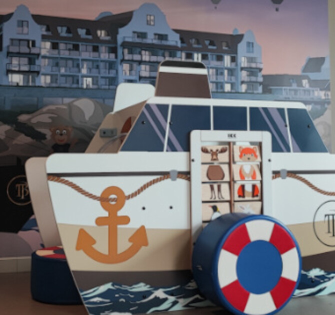 Hotel wybrał okleiny ścienne Forex z niestandardowym wzorem, co tworzy nowoczesny i czysty wygląd całkowicie w stylu hotelu. Logo i maskotka Bobbie zostały wkomponowane w okładziny ścienne i elementy do zabawy. Pozwala to dzieciom budować pozytywne skojarzenia z marką hotelu w młodym wieku. W końcu dzieci są gośćmi przyszłości! Jednym z najbardziej wyróżniających się elementów zabawy jest stół dotykowy, który jest niezwykle popularny wśród dzieci. Ten interaktywny stół jest wyposażony w wiele gier, dzięki czemu najmniejsi goście mogą się świetnie bawić. Wielodotykowy ekran pozwala na wspólną grę nawet czwórce dzieci. Ta konsola do gier jest również odpowiednia dla starszych dzieci, podobnie jak playstation.FourFun zapewnia wiele możliwości zabawy na 1m2. Różne gry są umieszczone na 4 bokach systemu do zabawy. Zapewnia to zabawę dla 4 dzieci jednocześnie. Łódź do zabawy jest również całkowicie w stylu hotelu. Wygląd dopełnia poduszka siedziska Softplay w kształcie boi ratunkowej.