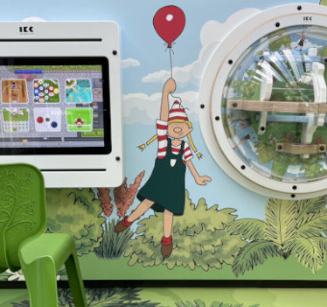W większym obszarze zabaw zwrócono szczególną uwagę na mniej mobilne dzieci. Duży stół do zabawy został umieszczony na rozpoznawalnym wzorze podłogi. Stół do zabawy ma 21-calowy ekran Delta na 2 różnych wysokościach. Aby zapewnić wszystkim dzieciom możliwość zabawy, pierwszy ekran został umieszczony wyżej. W ten sposób dzieci poruszające się na wózkach inwalidzkich mogą dotrzeć do niego na odpowiedniej wysokości. Na ścianie umieszczono specjalną grę Memory. Klocki gry Memory przedstawiają kilka obrazków związanych ze szpitalem, które dzieci mogą dopasować.