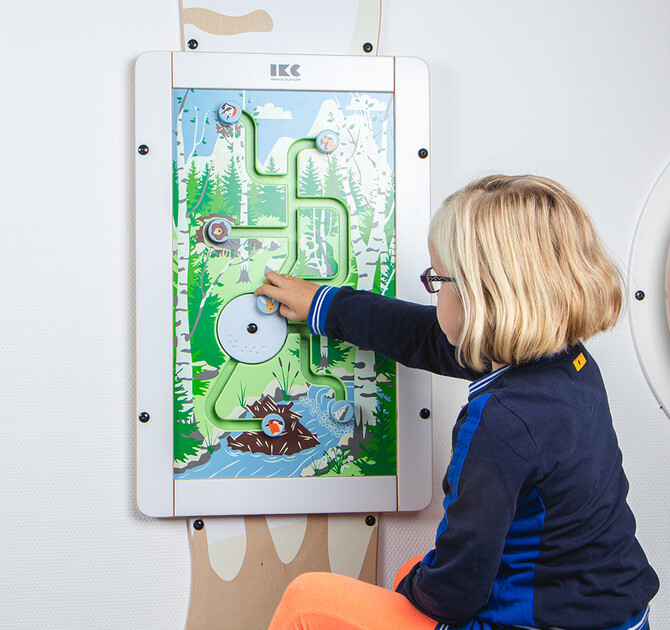 Into the Woods, w lesie to gra, w której dzieci mają za zadanie przyporządkować zwierzęta i przyprowadzać je z powrotem do domu. Prostokątna gra ścienna ma naturalną, nowoczesną ramkę wykonaną ze sklejki brzozowej z białym malowanym frontem, który pasuje do wielu miejsc. Ta gra ścienna może być używana jako samodzielny element do zabawy lub w połączeniu z istniejącymi produktami IKC, aby stworzyć zabawny kącik zabaw. Ta gra jest przeznaczona dla dzieci w wieku od 2 do 8 lat.