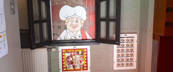 Achter een raampje dat niet meer werd gebruikt, heeft bakker Co een bijzonder plekje gekregen. We zorgden voor een perfect passend stuk Forex wandbekleding voor in het raampje, waarop Co te zien is in zijn keuken. Wanneer de kinderen de raampjes openklappen, komen er ook levensechte geluiden uit de keuken!