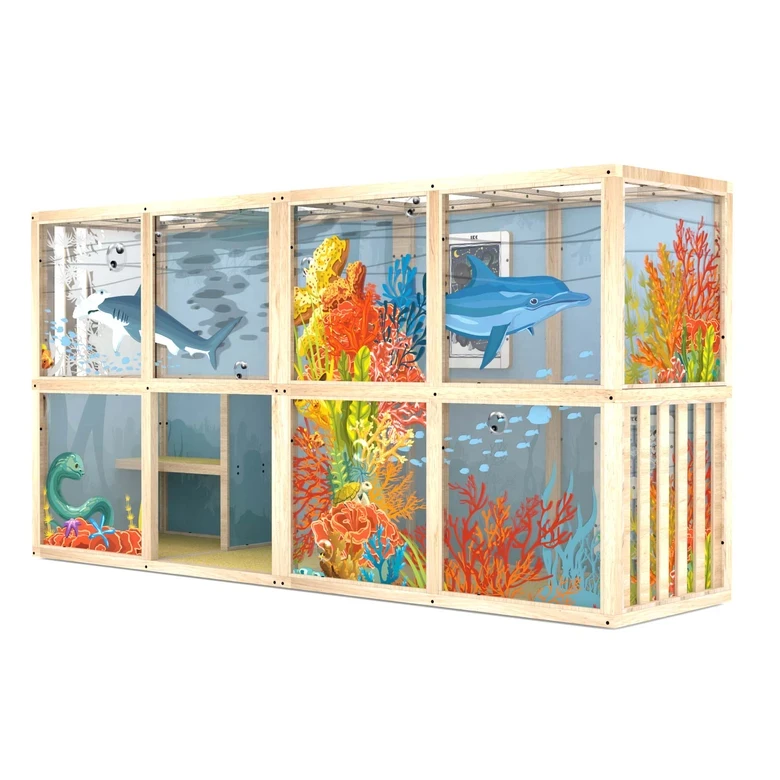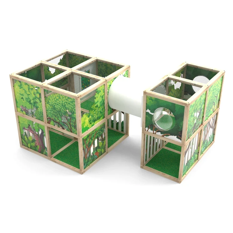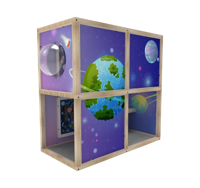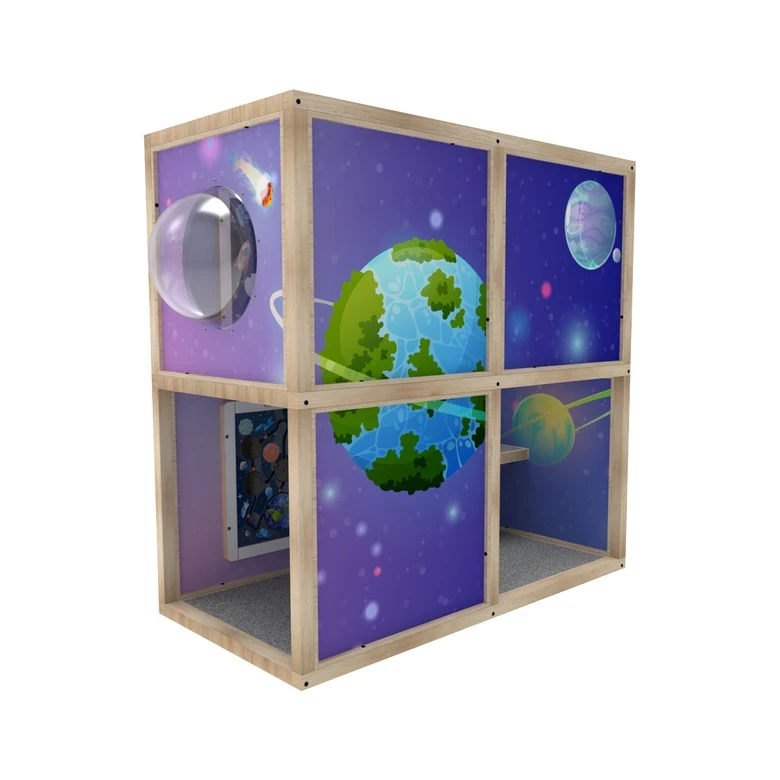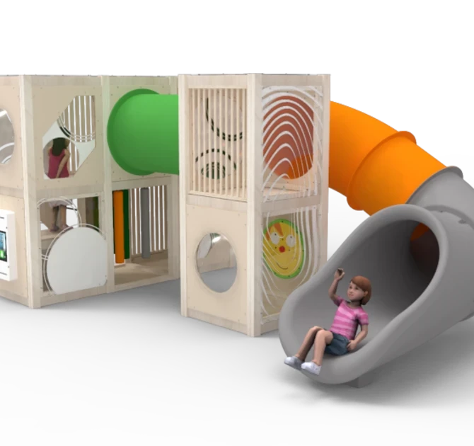 O Play@IKC oferece uma vasta seleção de painéis e complementos para reforçar ainda mais o valor lúdico e o impacto visual. Adicione painéis com janela em cúpula ou policarbonato para melhor visibilidade, integre jogos de parede para maior interação ou escolha um escorrega como saída divertida.