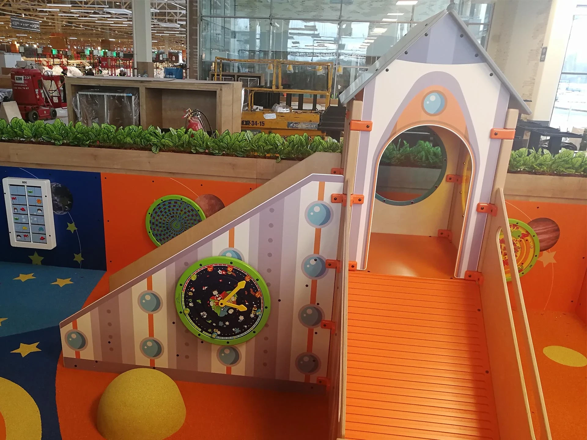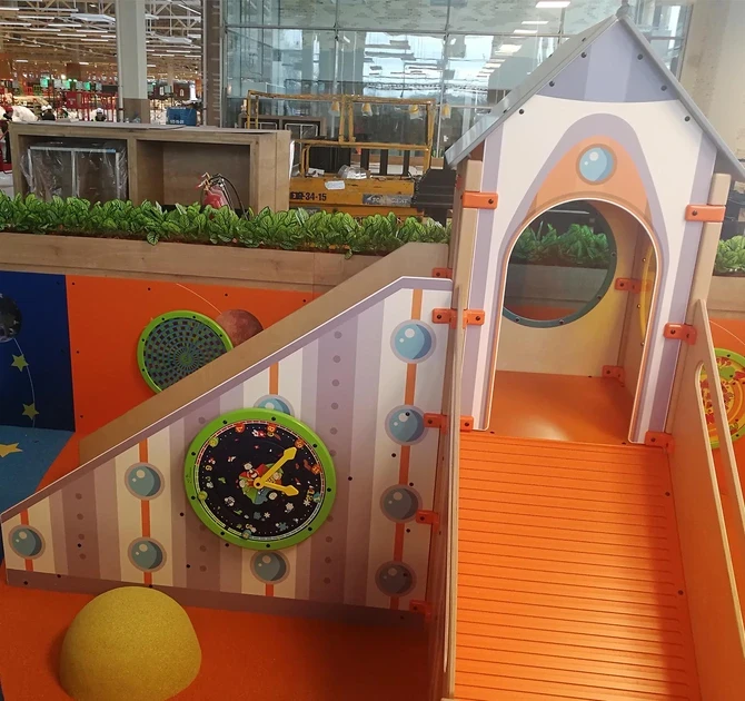 Наши дизайнеры совместно с заказчиком спроектировали детскую игровую зону в фирменном космическом стиле компании Globus.