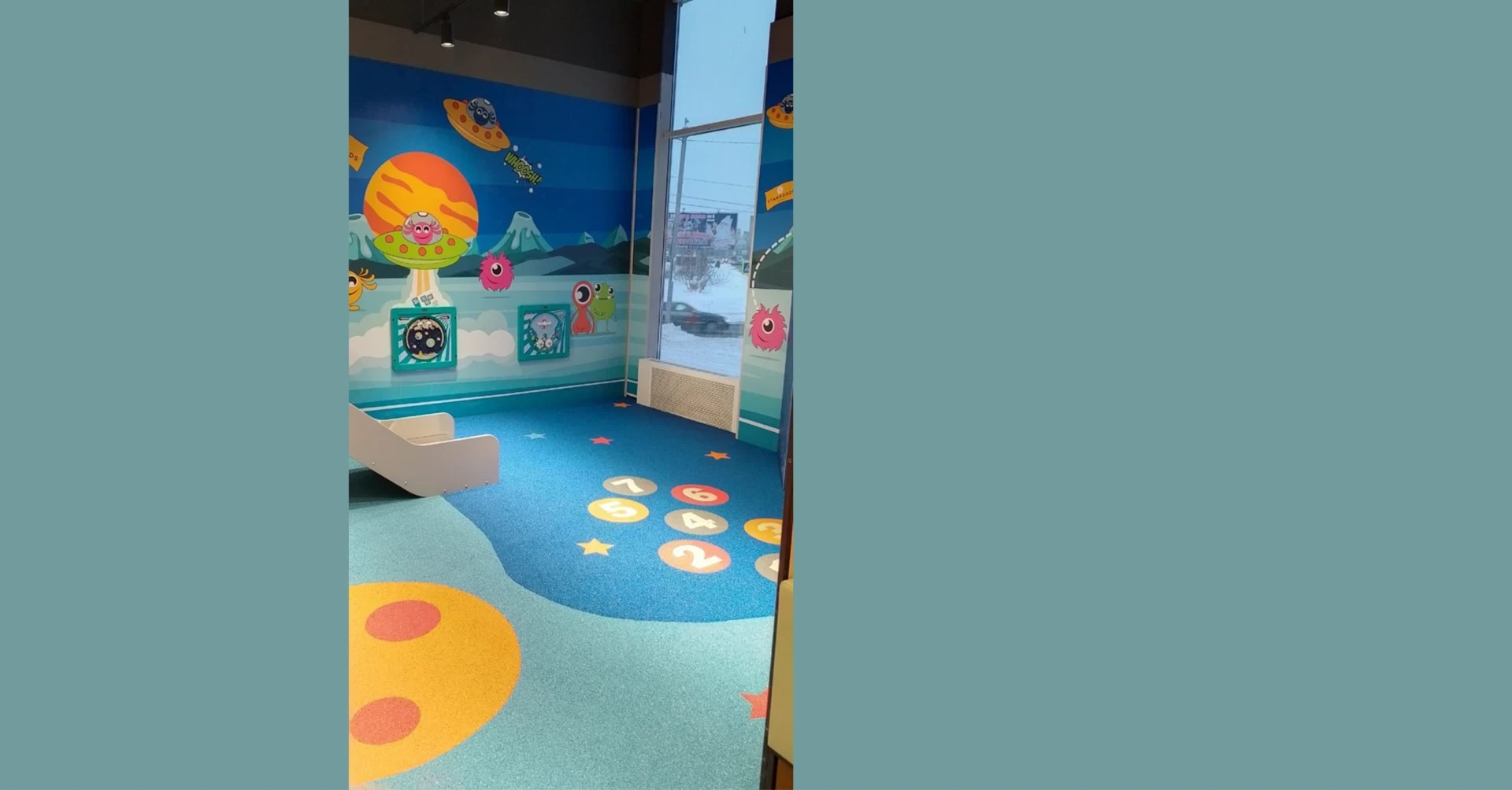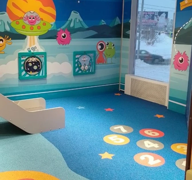 Игровая зона площадью 30 м2 спроектирована нашей компанией специально для детей разных возрастов от 1 до 16 лет.