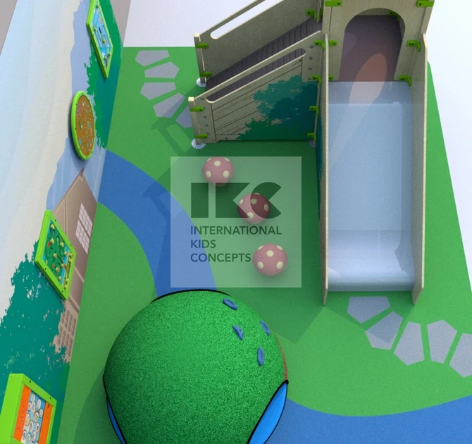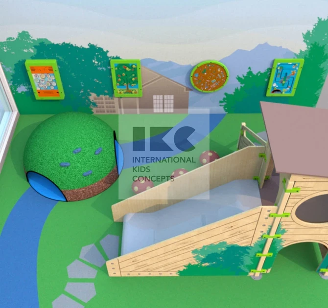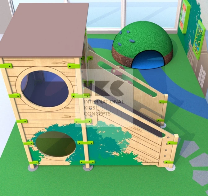 Для галереи в ТРЦ мы спроектировали небольшую детскую зону в природном стиле. Натуральные материалы, оригинальные грибочки из ЕПДМ крошки, холм-полусфера с зацепами, а также настенная графика создают эффект присутствия для детей в лесу. Коллекция игровых модулей classic в зеленом цвете дополняет игровые элементы детской площадки.