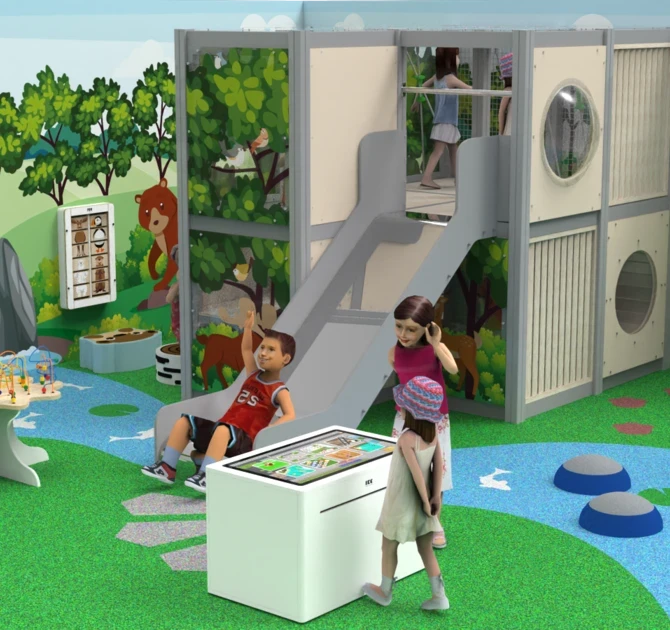 Игровой комплекс выполнен в современном эко-стиле из дерева и натуральных материалов. Дети надолго увлекутся необычными играми и задачами, которые размещены снаружи и внутри комплекса. Малыши до 3х лет могут играть снаружи в развивающие, интерактивные модули, дети постарше весело играют внутри. Игровой комплекс безопасен, спроектирован в соответствии со стандартами безопасности для детских площадок по ТР 042. Идеально сочетается с нашим развивающим оборудованием, интерьерными решениями из ЕПМ крошки, тематическим оформлением стен.