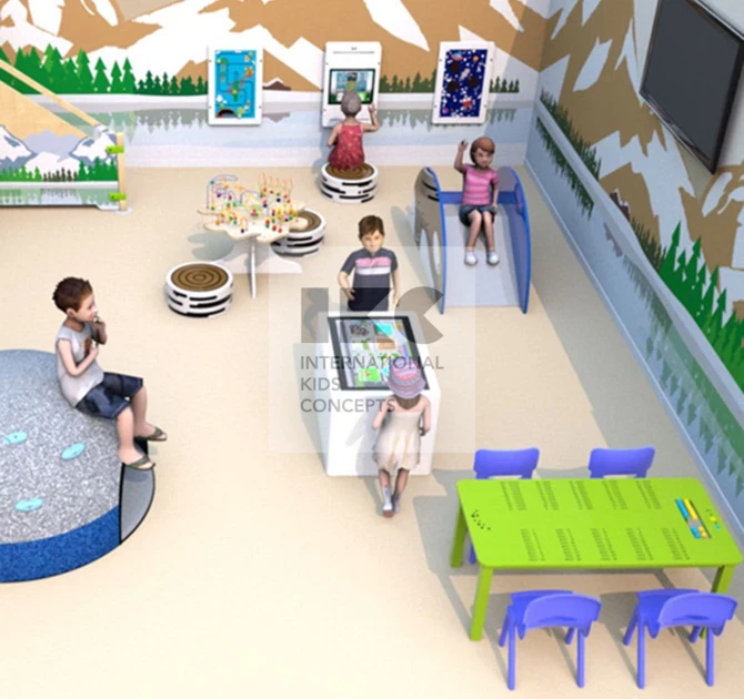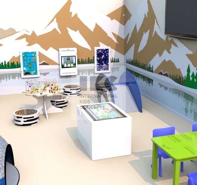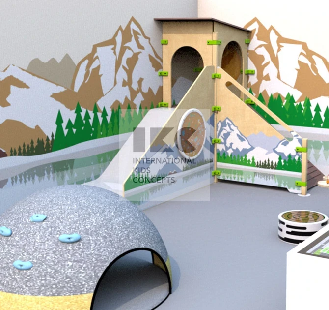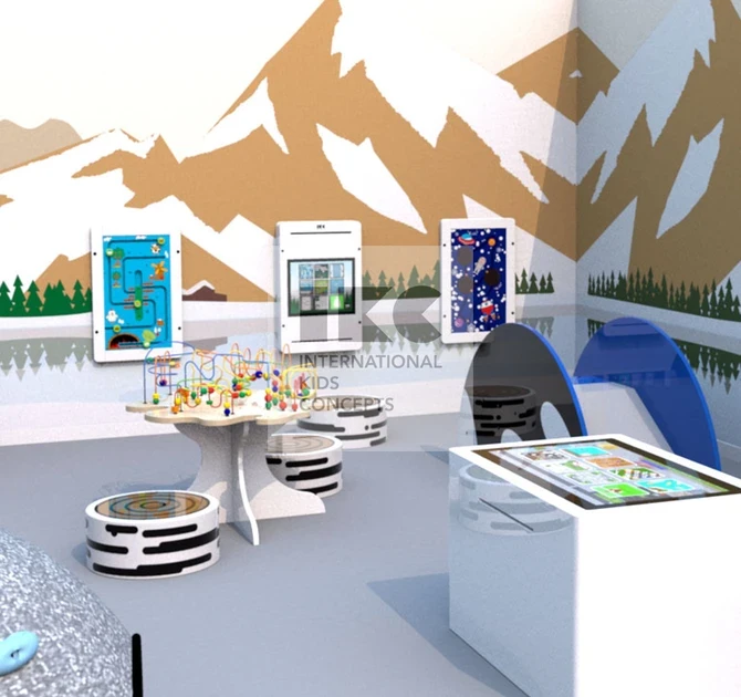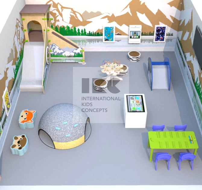 Проект детской комнаты для ресторана в современном стиле с альпийским пейзажем для детей от 1 года до 14 лет. Содержит интерактивное оборудование, игровые терминалы, современные игровые комплексы для активных игр – стилизованную горку и полусферу.
