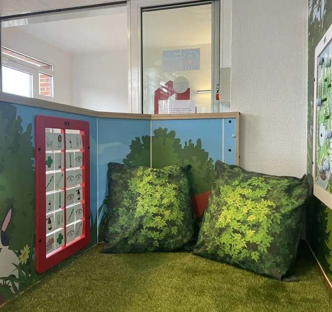 Çocuk alanı, en son oyun konsepti Play@IKC'den ilham alan baskı panellere sahip özel bir çit ile çevrilidir. Doğa imgeleri ve yerel vahşi yaşam ile huzur verici ve doğal bir atmosfer uyandırmak için çocuklara özel güvenli ve ilgi çekici bir mekan oluşturulur. Yaprak desenli minderler ve yapay çim ise rahat bir dokunuş katarak ebeveynler gönül rahatlığıla ilaçlarını alırken çocukların dinlenebileceği bir alan ortaya çıkarır.