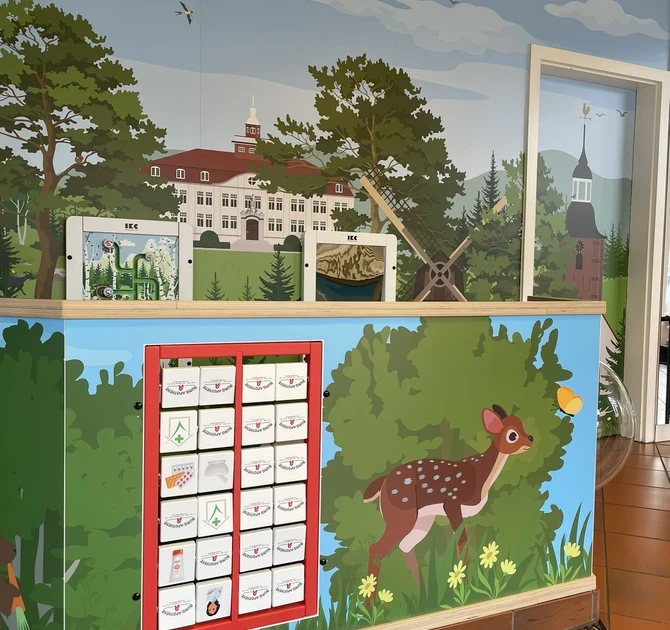 Cloppenburg'de bir çocuk doktorunun yanında bulunan Burg-Apotheke çocukların, doktor randevularından sonra ilaç almak üzere eczaneyi ziyaret ettiklerinin farkına vardı. IKC ise genç ziyaretçiler için daha misafirperver bir deneyim sunmak üzere özel bir oyun alanı tasarladı. Eczanenin sessiz bir köşesine yerleştirilmiş oyun alanı, hem çocuklar hem de ebeveynler tarafından kolayca görülebilir.