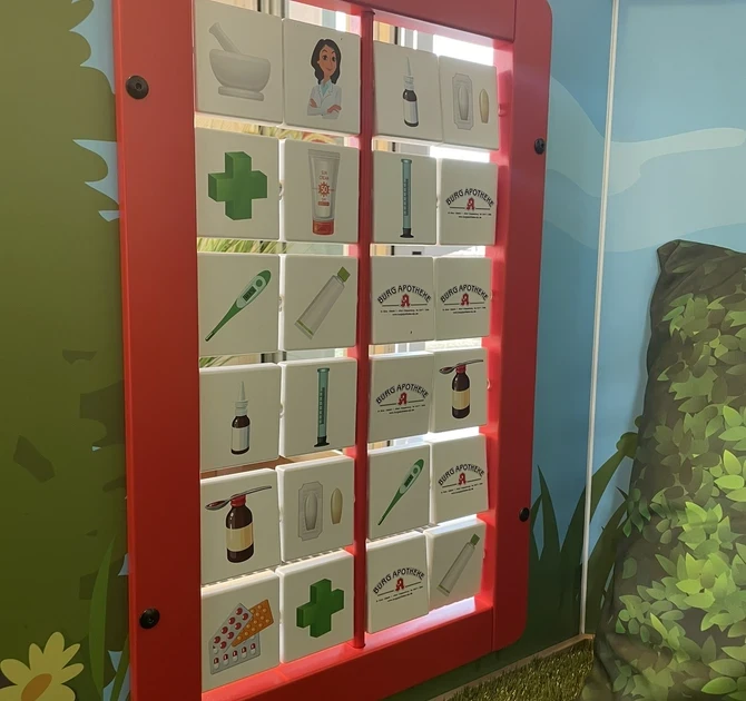 Oyun alanında doktor, eczacı ve eczanenin logosunu tanıtan görüntülerle bir hafıza oyunu dahil çeşitli duvar oyunları vardır. Bu unsurlar mekan ile kişisel ve eğlenceli bir bağ kurmaya yardımcı olur.