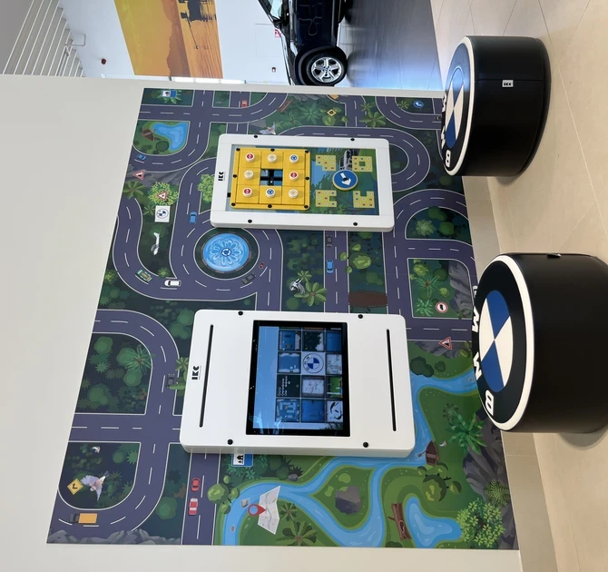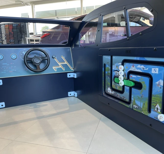 Bu arabaya, üç tarafı BMW temalı tasarımlar ile ipek baskılı bir IKC Oyun Kulesi eşlik ediyor. Farklı BMW araba parçaları ile özelleştirilmiş hafıza oyunu ise genç beyinler için bir mücadele ortaya koyarken markanın ikonik imajını güçlendiriyor. Yol Gezisi Duvar Oyunu ve 17 inç Delta interaktif ekran, oyun alanını daha da zenginleştirirken ebeveynler de en son BMW modellerini keşfederken çocukların eğlenmelerini ve meşgul olmalarını sağlar.